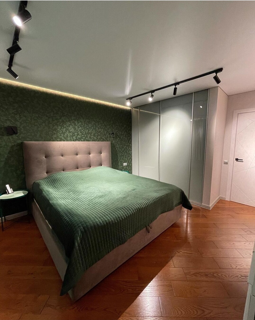 Для красивого оформления спальных комнат можно использовать сатиновые натяжные потолки. Эта продукция обладает мелкозернистым рельефом и особенным – «жемчужным» - сиянием. Имитация тканевого полотна является отличным дизайнерским решением (плёнка ПВХ, применяемая в этом случае, имеет антиаллергенную пропитку и не притягивает к себе пыль).