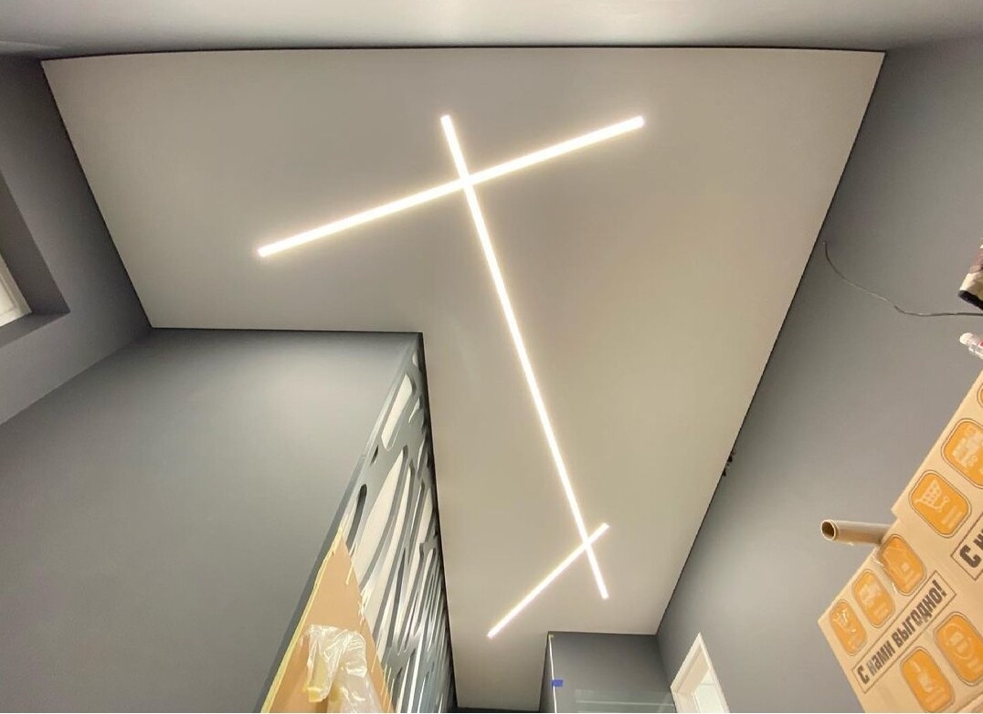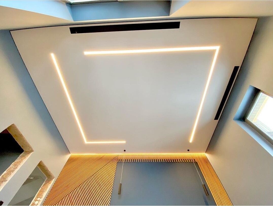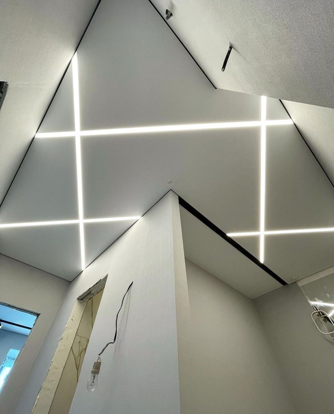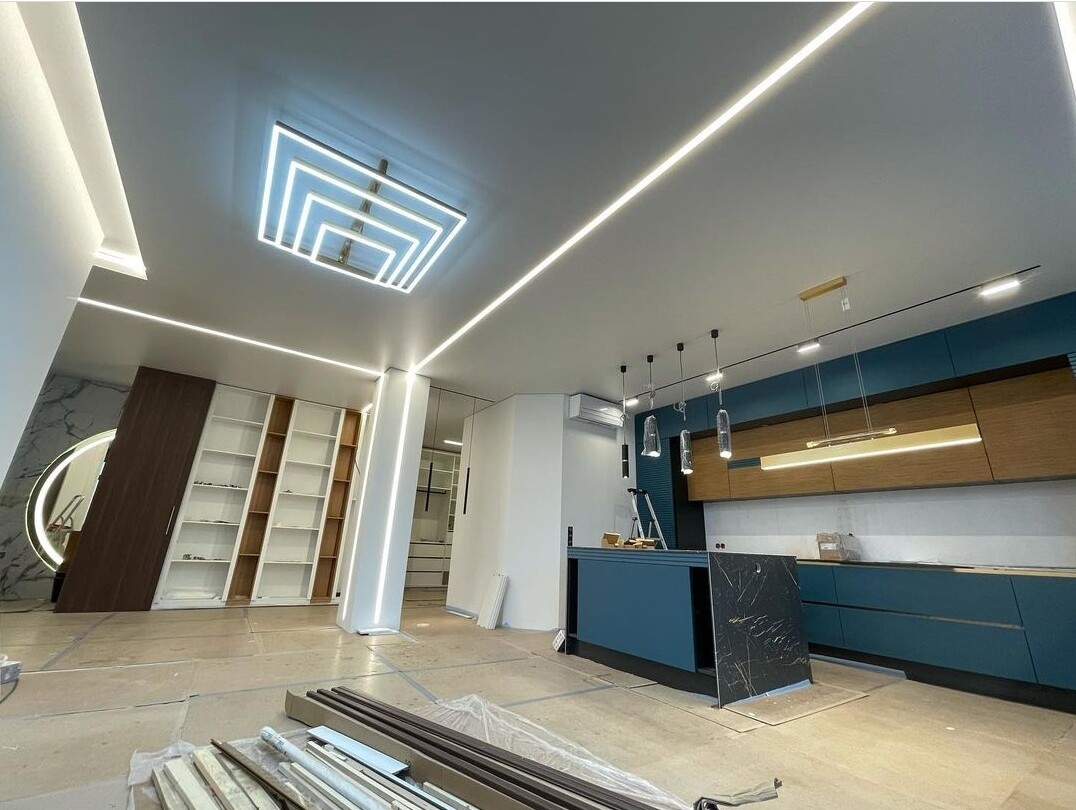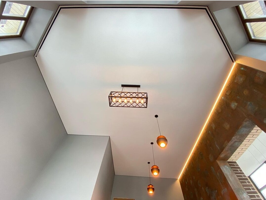 Натяжные потолки в Гродно, цены (стоимость), матовые, глянцевые, сатиновые, тканевые, двухуровневые с установкой, световые линии, теневые потолки, парящие потолки