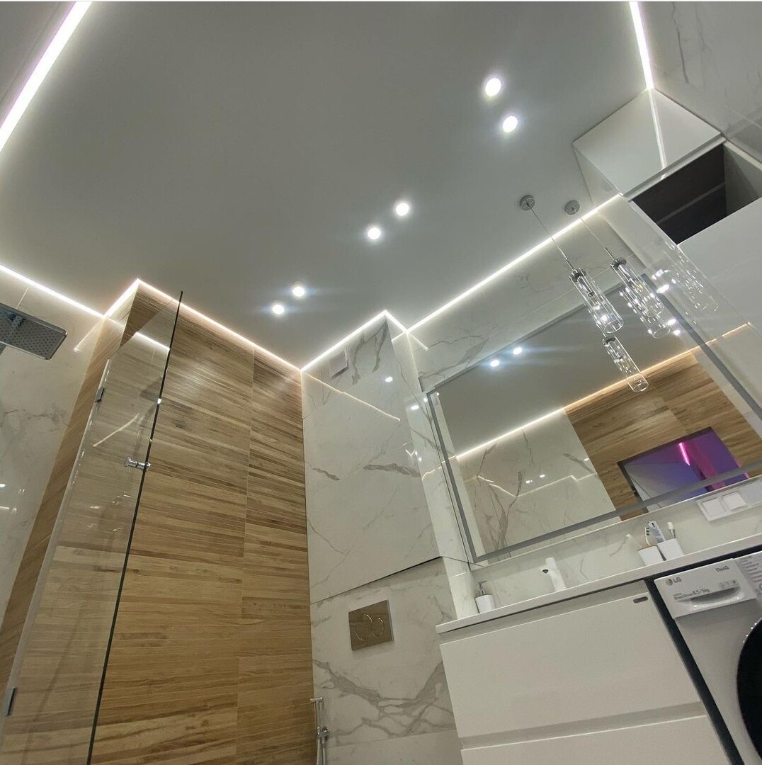 Натяжные потолки в санузле монтируются все чаще. Ведь для помещений с большой влажностью такое покрытие на потолок самое идеальное, оно нечувствительно к влаге. Бактерицидное полотно позволит не допустить появление плесени и бактерий в помещении.