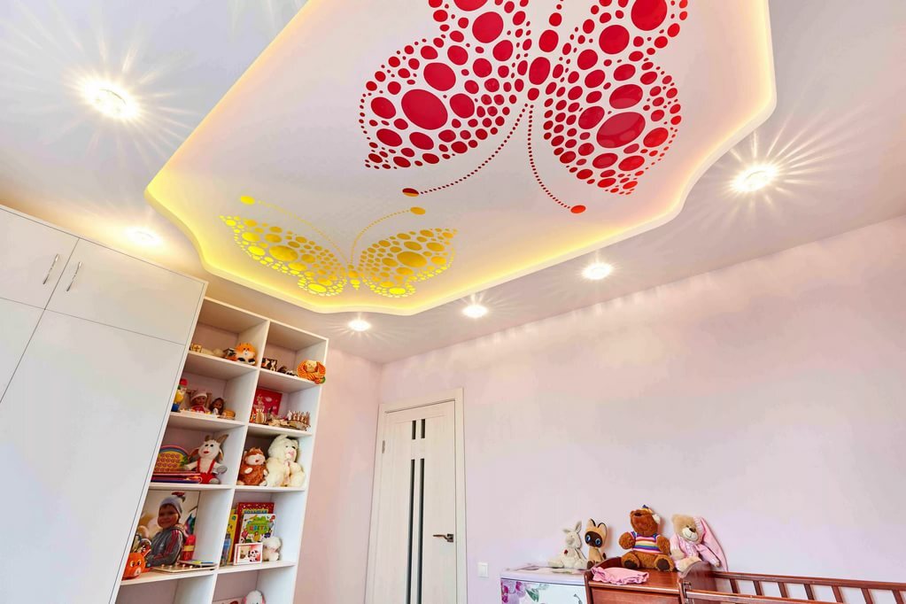 Интерьер детской комнаты должен быть светлым и радостным, а потому для такого помещения нередко выбирают натяжные потолки с фотопечатью. Практичность и экологическая чистота подобных изделий сочетается с внешней оригинальностью и простотой ухода за ними (по поводу устойчивости рисунка беспокоиться не стоит).