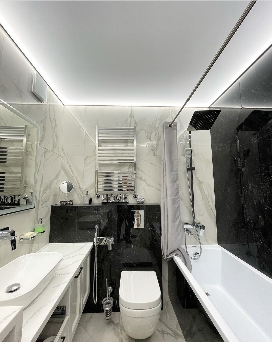 Натяжные потолки в санузле монтируются все чаще. Ведь для помещений с большой влажностью такое покрытие на потолок самое идеальное, оно нечувствительно к влаге. Бактерицидное полотно позволит не допустить появление плесени и бактерий в помещении.
