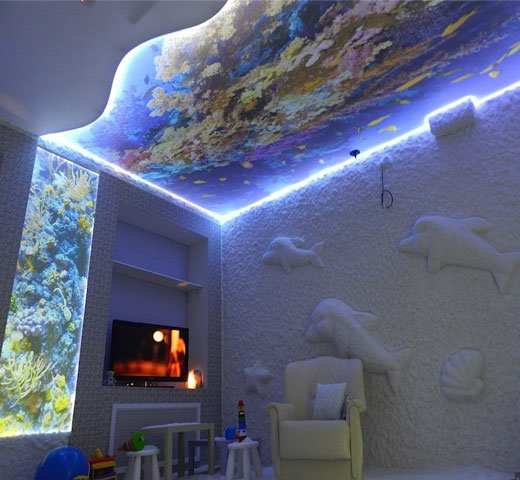 Интерьер детской комнаты должен быть светлым и радостным, а потому для такого помещения нередко выбирают натяжные потолки с фотопечатью. Практичность и экологическая чистота подобных изделий сочетается с внешней оригинальностью и простотой ухода за ними (по поводу устойчивости рисунка беспокоиться не стоит).
