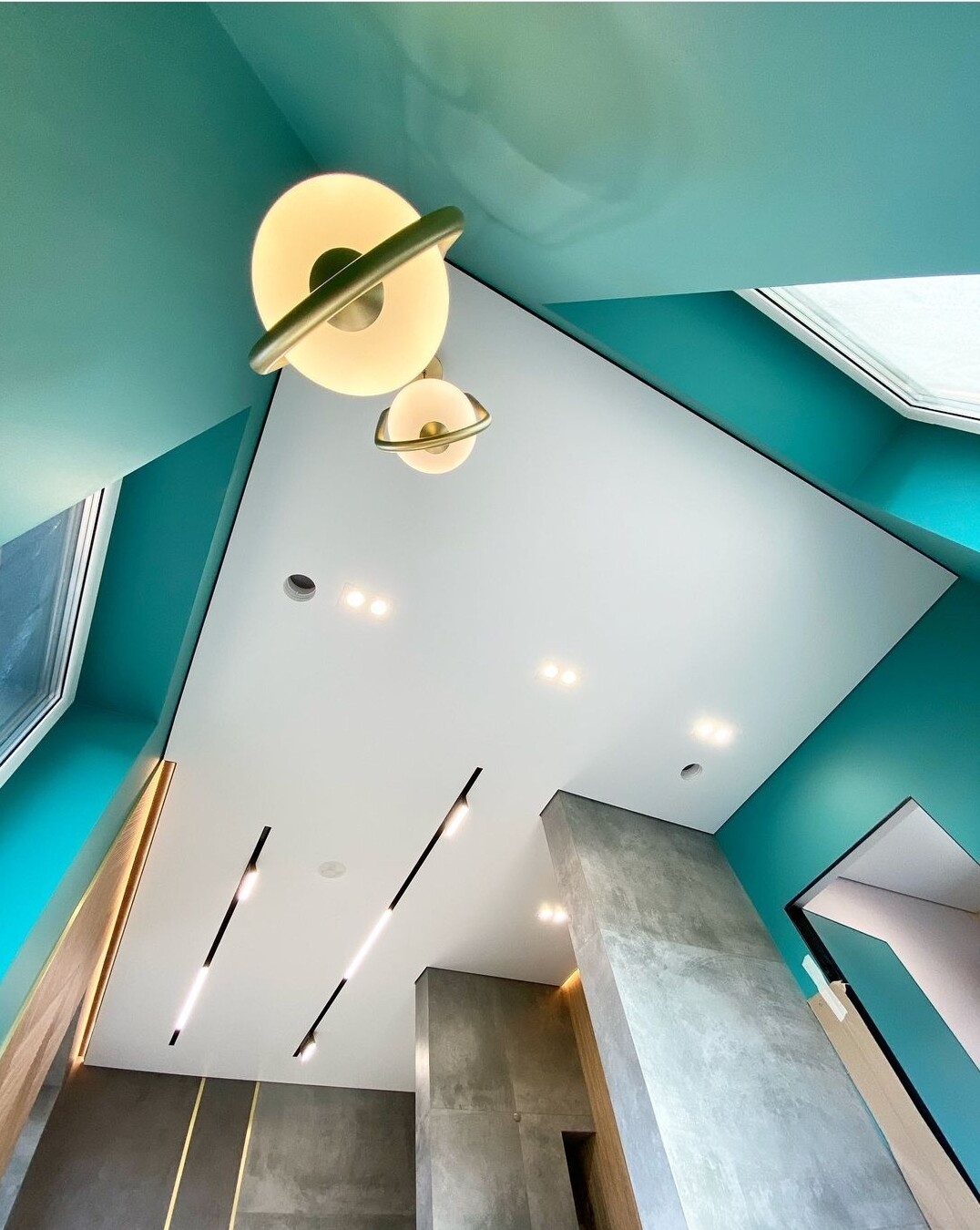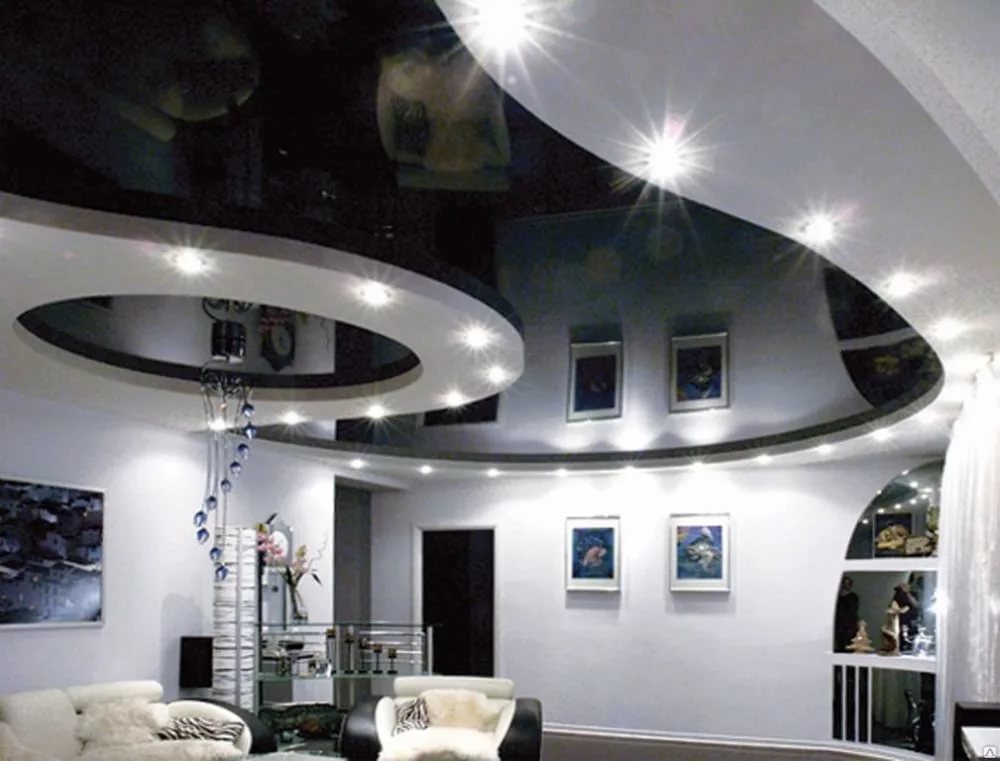 Установка натяжного потолка производится ниже уровня базовой поверхности, успевшей прийти в негодность. Можно визуально разделить на зоны всё пространство комнаты или создать иные художественные эффекты. Умелое применение цвета позволит добиться желаемой гармонии потолка с окружающей обстановкой. Встроенные светильники, располагаемые в нужных местах, удачно завершают общую картину.