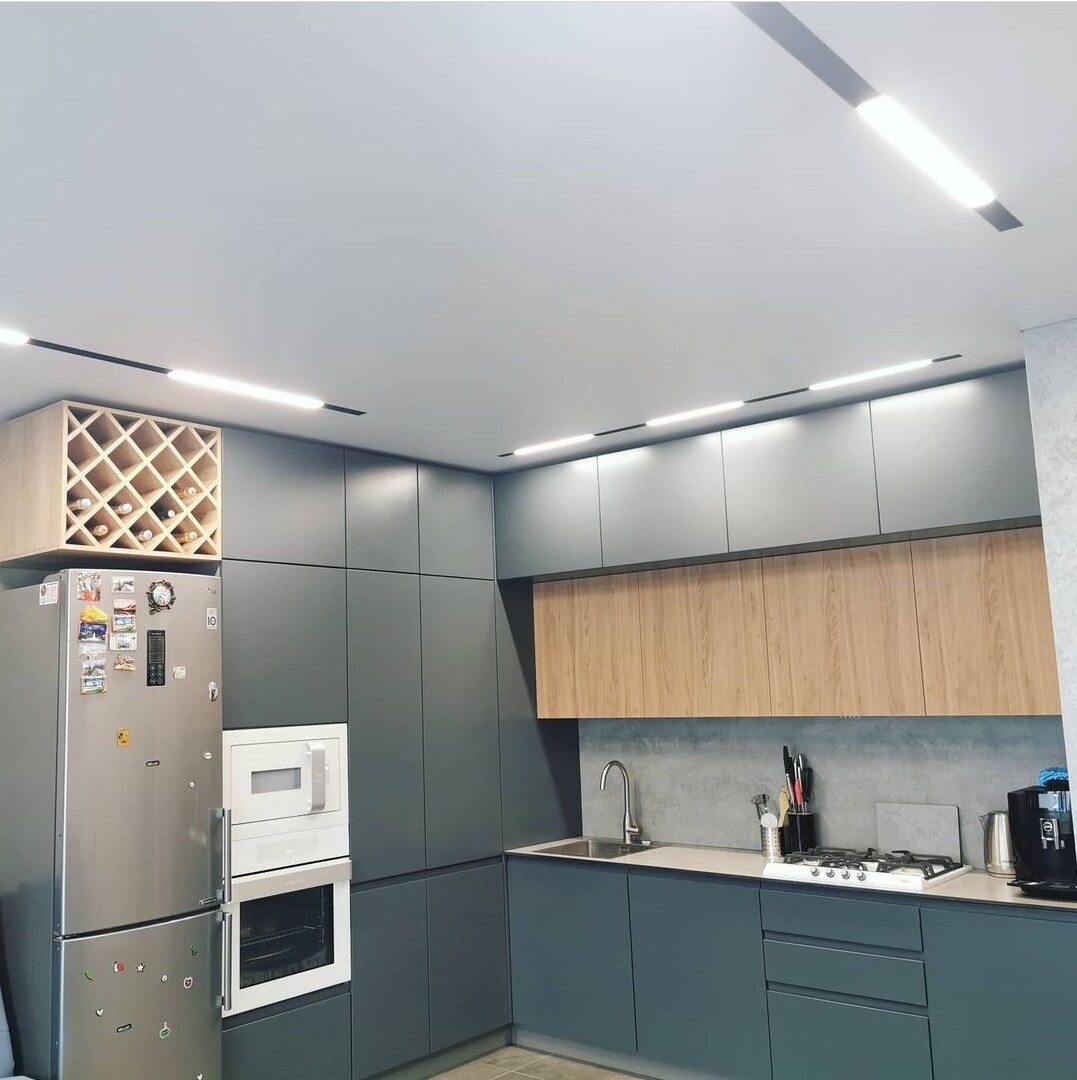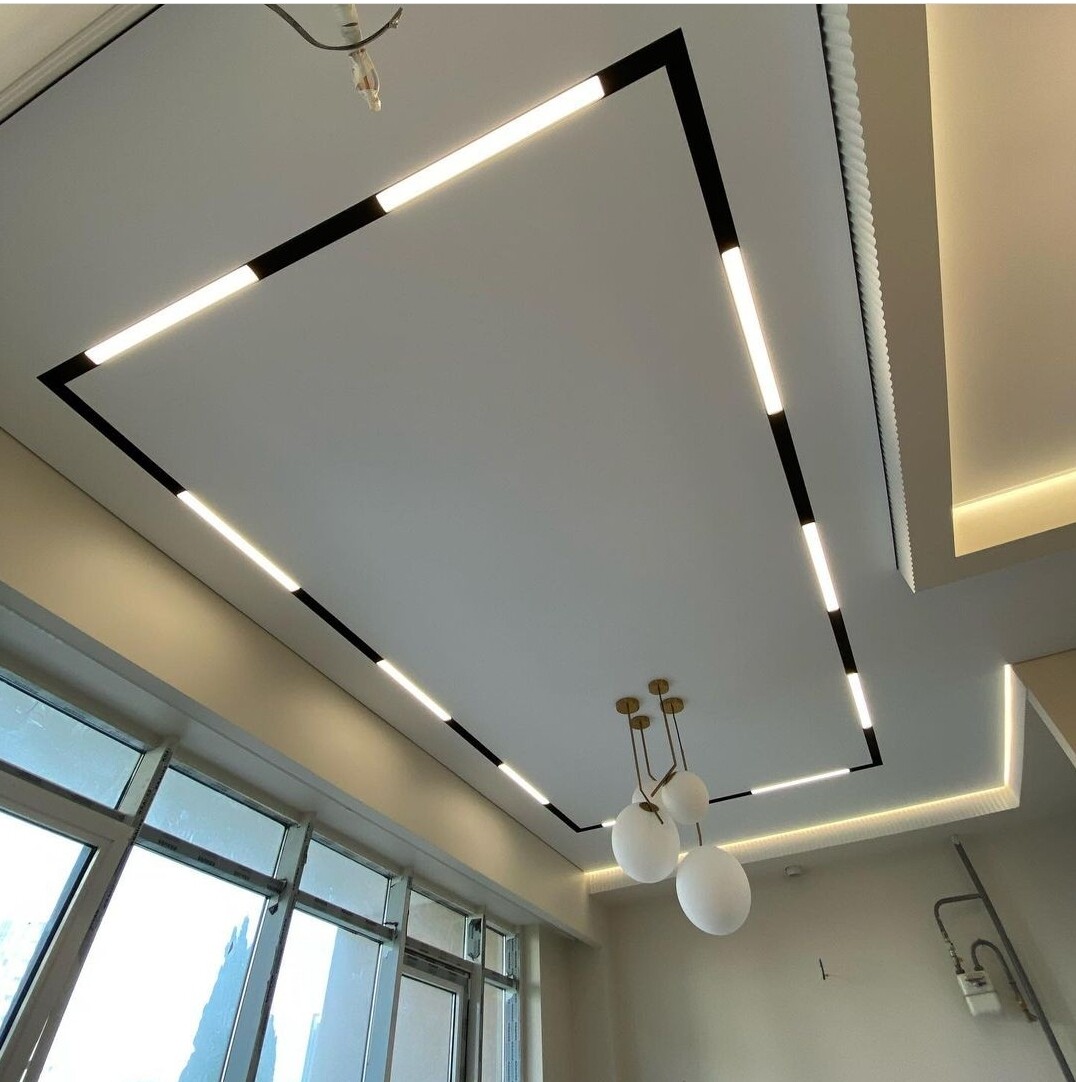 Инновационные профильные системы от нашей компании позволяют встроить в полотно абсолютно любой шинопровод и светильник.