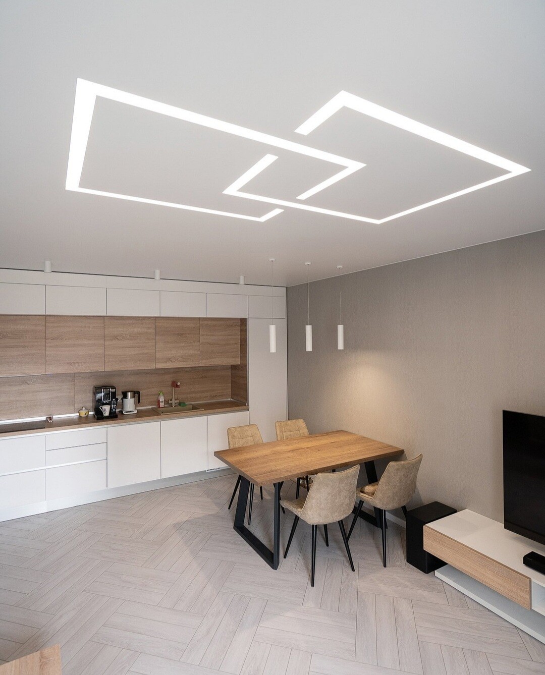 "Световые/парящие линии" - это отличное дизайнерское решение в создании уютной атмосферы Вашего дома. Данный прием позволяет воплотить любые, даже самые смелые задумки, на потолке. Благодаря световым линиям можно: зонировать помещение в зависимости от потребностей в той или иной ситуации; аккуратно разделить большие полотна, без использования сварных швов и перегородок; создать неповторимый и единственный в своем роде светильник по Вашим наброскам и чертежам. Мы в свою очередь поможем в выборе оптимального количества и мощности светодиодной начинки. Также предоставим бесплатные графические макеты, благодаря которым, Вы сможете точно сориентироваться с расположением и размерами световых линий.